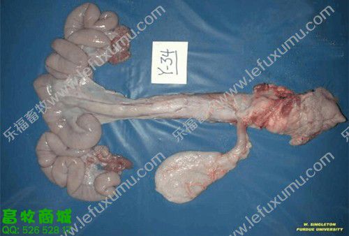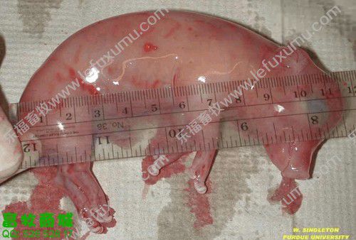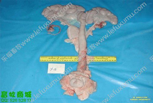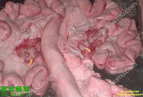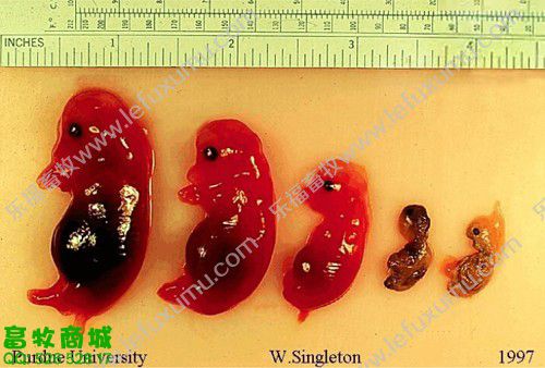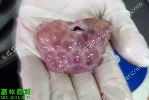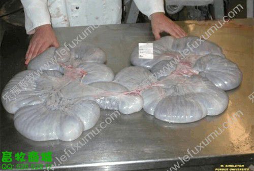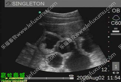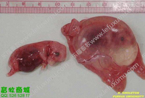 1、未受孕前 2、有滤泡了 3、成熟卵泡 卵巢上面布满了密密麻麻地卵泡(上图) 4、精卵结合 猪精子进入母猪的生殖管道后,将开始“艰难地跋涉”,它们一部分贮存在子宫内陷窝中形成若干个精子贮库,精子在这些贮库中不断释放,以保证受精部位总是不断有受精能力的精子出现,等待卵子的到来。精子在母猪生殖道内存活时间最长为42 h,但精子具有受精能力的时间仅25~30 h,精子在母猪生殖道内经过2-4h后才有受精能力。这就是通常所说的“精子获能”,只有获得受精能力后的精子才能与卵子结合。 5、胚囊 从精子穿透进入次级卵母细胞后到第一次卵裂的时间大约15—20h。配种后一星期是卵子受精和受精卵分裂的关键时期,若此时母猪代谢过盛,能量过高,影响孕酮分泌会使部分受精卵死亡,从而降低受胎率。所以,母猪配种后一星期内切忌喂料过多。 6、受孕25天 最左边是正常的 13日龄左右完成着床阶段,21日龄左右完成器官分化阶段。 妊娠第3周时,正值胎儿器官形成阶段,此时胚胎会在竞争有利其发育的蛋白质类物质时,表现强存弱亡现象。 7、受孕28天之后B超影像 8、受孕58天的子宫全景 9、受孕60天后 60-70天,此时,胚盘停止发育,而胎儿发育加速,营养供应不足可引起胚胎死亡,这一阶段死亡数占胚胎总数的5%-10%。