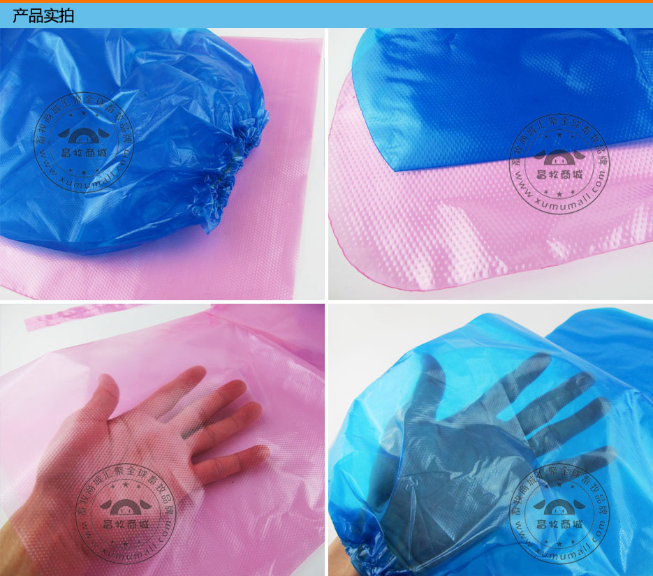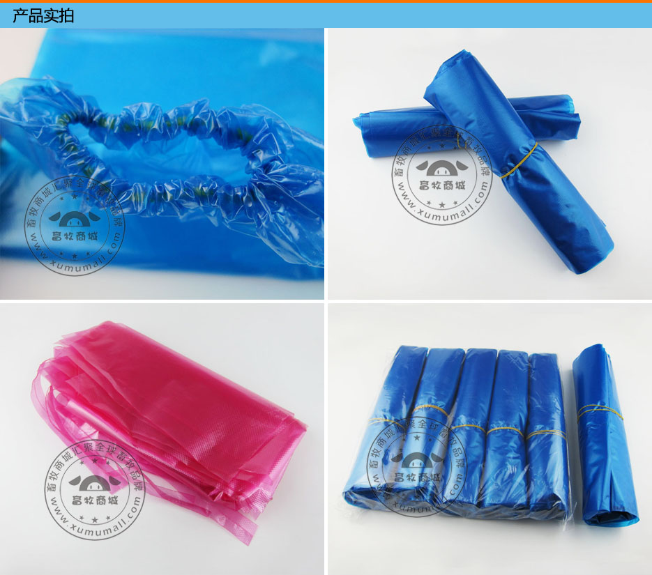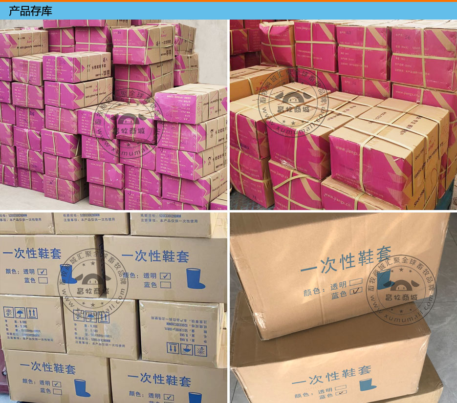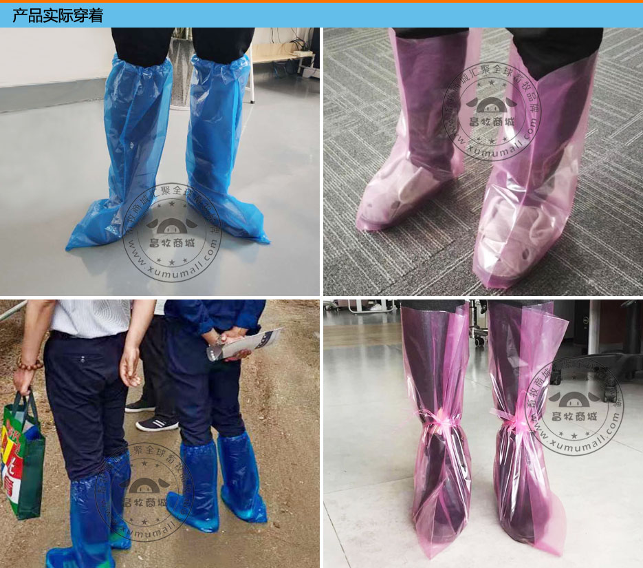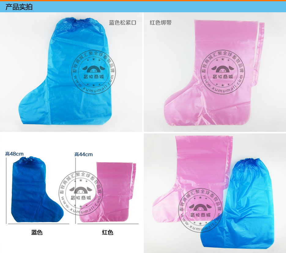 产品信息: 名称:长筒鞋套 产品规格: 蓝色松紧口,高度48cm,一卷(5双),一包5卷(25双),一箱20包(500双) 红色绑带型,高度44cm,一包(10双),一箱50包(500双) 产品特点: 加厚聚乙烯材料,是其他pe鞋套厚度的2倍,不易踩烂、防尘免疫等。 适用于:养殖场,实验室,人工授精站,制药企业,无尘机房,医疗卫生场所等。