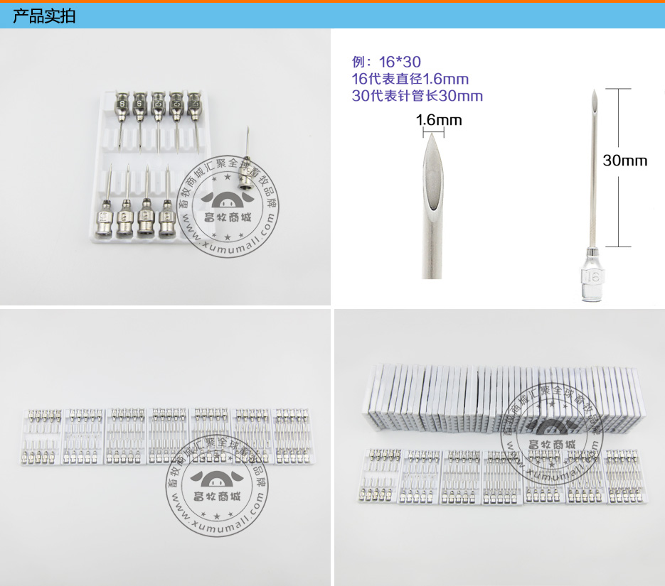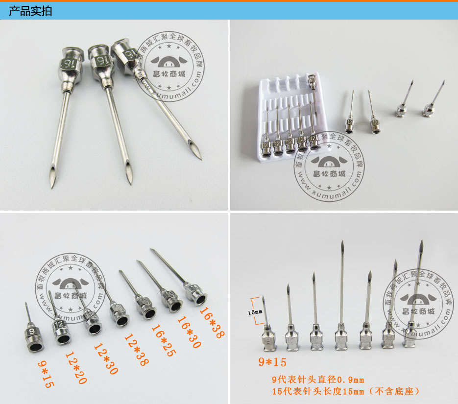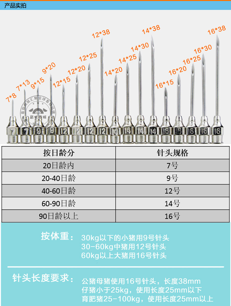 产品信息: 名称:不锈钢针头 产品特点: 不锈钢材质,加厚针壁,不易折断。 如何选择合适的针头? 刚出生~30kg以下仔猪用9号针头,针管长度15mm 30kg~60kg中猪用12号针头,针管长度25mm~38mm 60kg以上大猪用16号针头,针管长度30mm~38mm