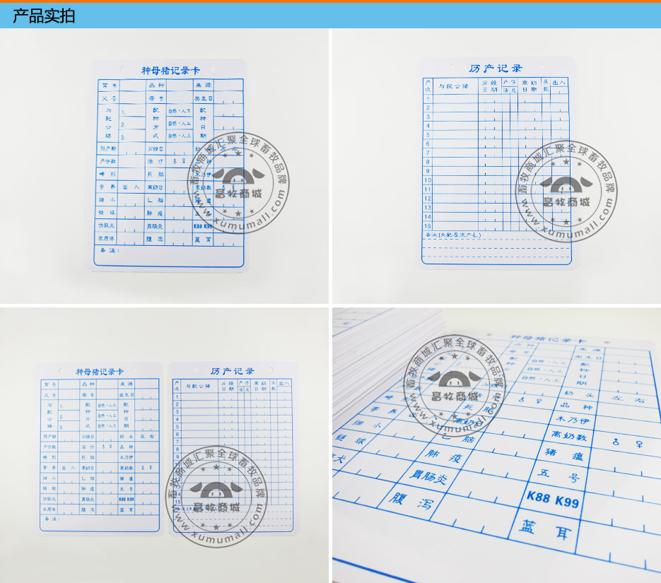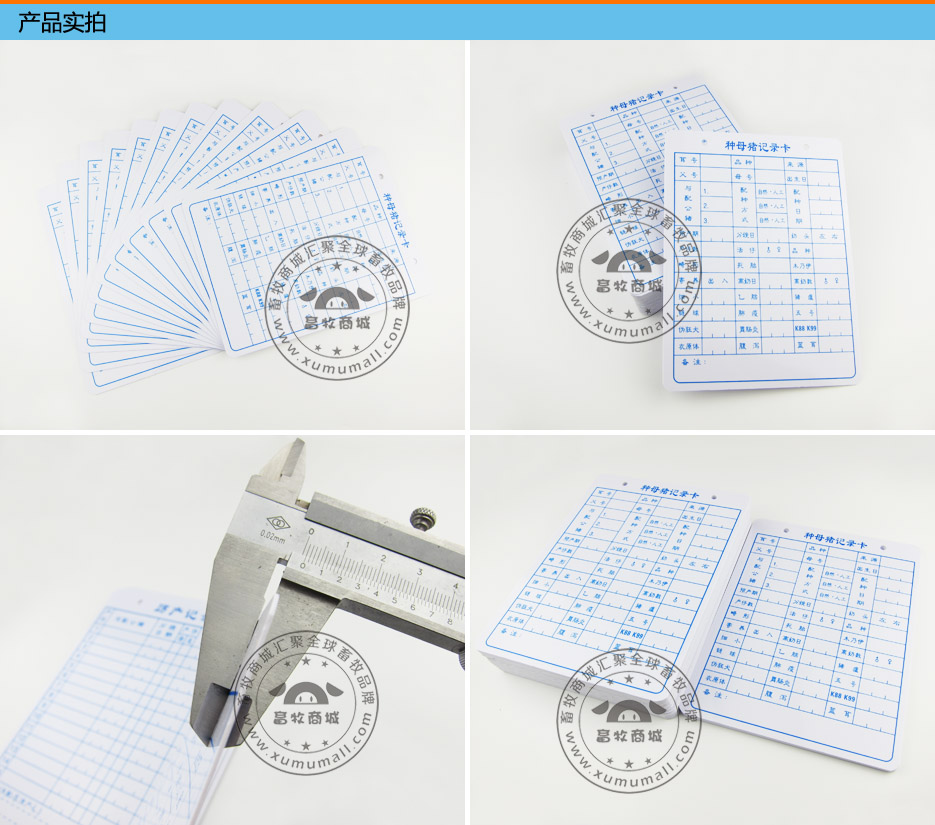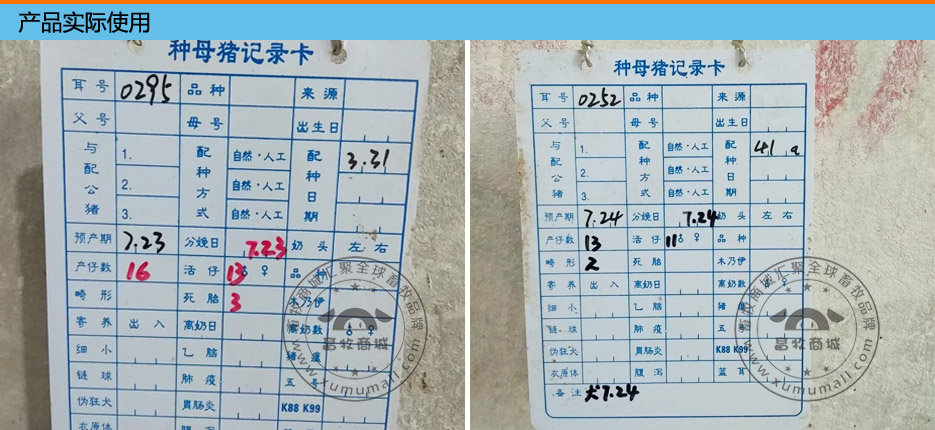 产品名称: 母猪记录卡(母猪妊娠记录卡) 产品特点: pvc材质分正反两面,正面为种母猪记录卡、背面为产科纪录。 主要用于追踪母系与仔猪疾病与防疫情况,产科记录即为原先的配种记号牌,用于追踪与配种猪情况、活死胎和仔猪存活情况,方便日后科研及调查使用。