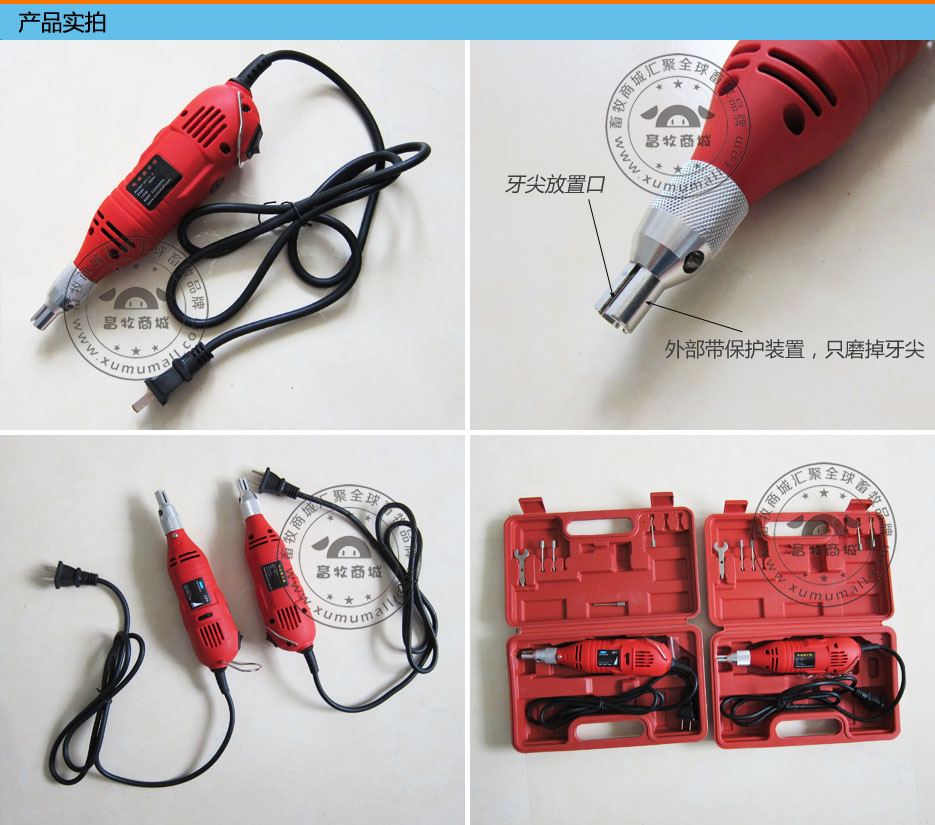 产品信息: 名称:电动磨牙器(仔猪电动磨牙器) 产品特点: 可调速电动磨牙器是专为猪磨牙以及小型宠物、大型动物,而设计制造的专用工具。 1)磨牙器可以磨平剪牙后牙齿的断面,从而可以让母猪进行轻松哺乳。 2)有效防止仔猪打斗时相互间造成伤害,通过磨牙可以显著减少仔猪的死亡几率。 3)修复坏损牙齿,提高仔猪进食量、减少口腔异味、牙龈炎、牙龈出血化脓等。 技术参数: 电压:220V、50Hz 功率:125W 转速:8000-32000rpm