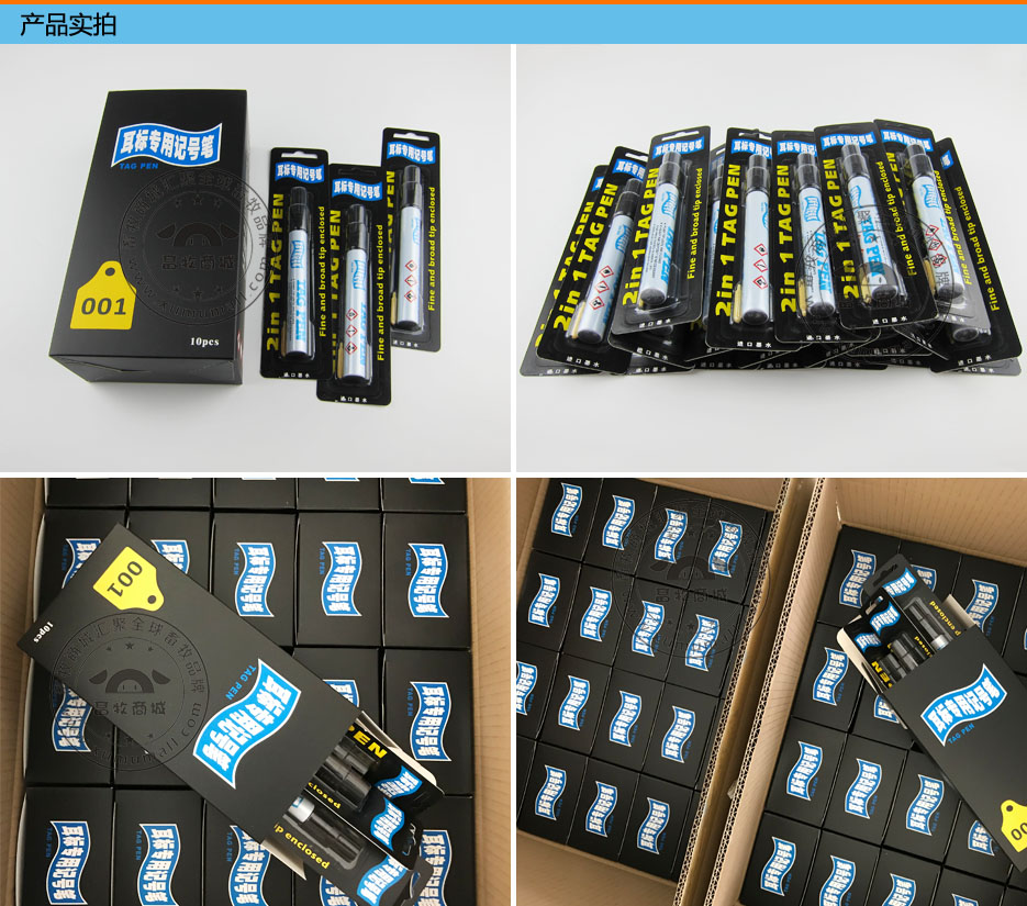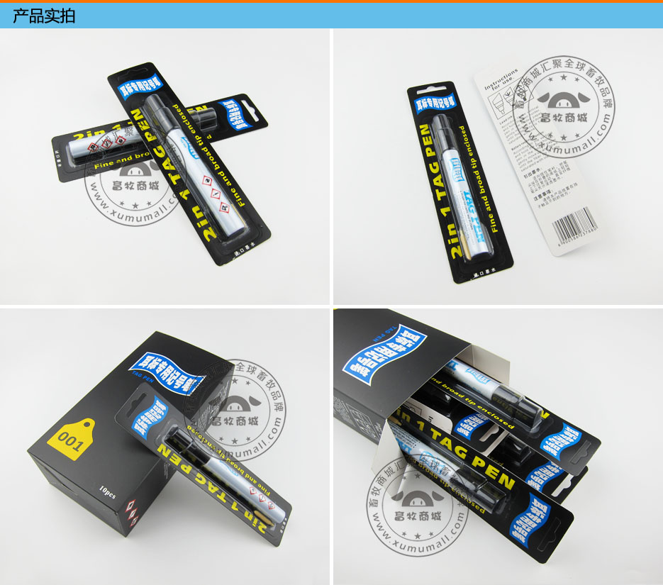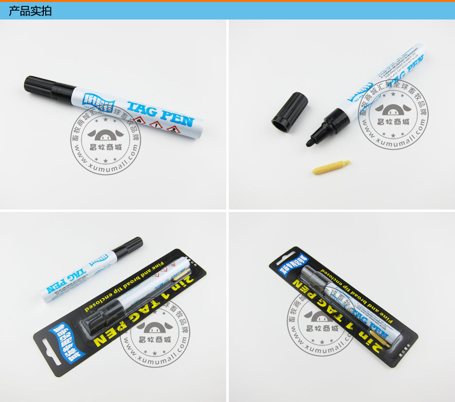 产品信息: 名称:专用耳标笔 产品特点: 在无字耳牌上写数字编号或做记录,渗透力强,不退色,耐用不挥发。 使用介绍: 1.每次使用前摇动笔身数次,保证药液混合均匀。 2.笔嘴向下,按压3到4次,直至漆油渗出笔嘴。 3.书写后必须盖紧笔帽,防止药液挥发以延长使用寿命。 4.书写时间长,可写大约800个耳牌。 5.进口油墨配件,字体浓黑,长久不掉色。