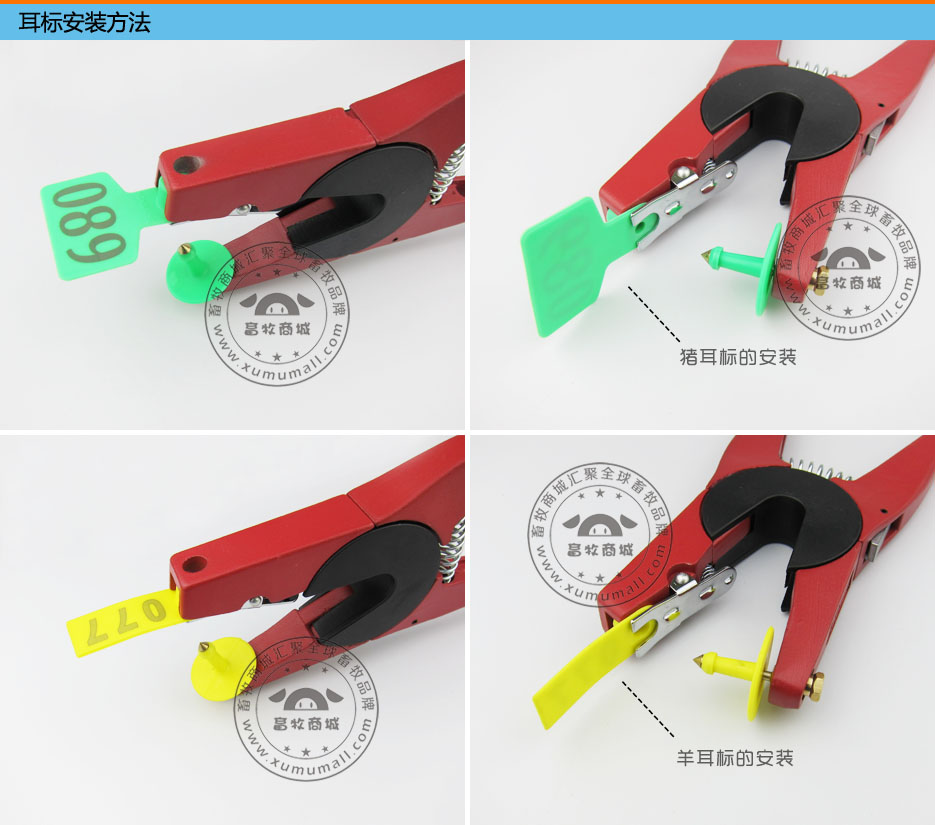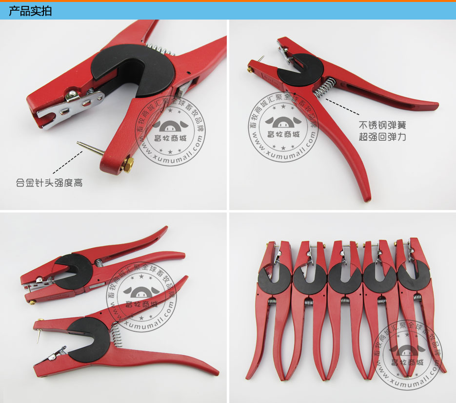 产品信息: 名称:耳标钳(猪用耳标钳) 产品特点: 精钢铸造,合金针头,能重复使用不少于3000次。 不锈钢超大回弹力弹簧,尽可能降低牲畜耳朵撕裂的发生率 。 耳标钳可快速给牲畜加上免疫标识,按压,钉针,退针一气合成。