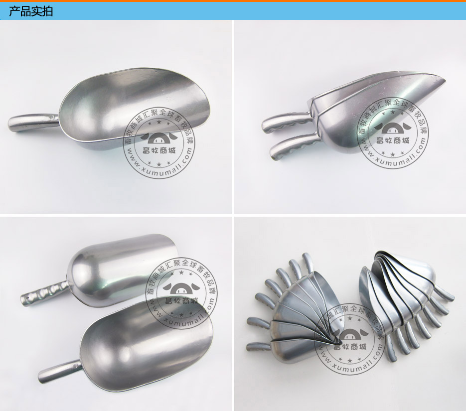 产品信息: 名称:铝合金饲料铲(饲料铲) 规格:全长36.5cm,手柄长11.5,宽14cm,可装约3斤多饲料。 产品介绍: 手柄和铲身一体压铸成型,不易断裂。 手柄波纹设计,拿握舒适。 优质全铝材质,外观光滑坚固耐用,适合喂猪,喂鸡等动物时添加饲料使用