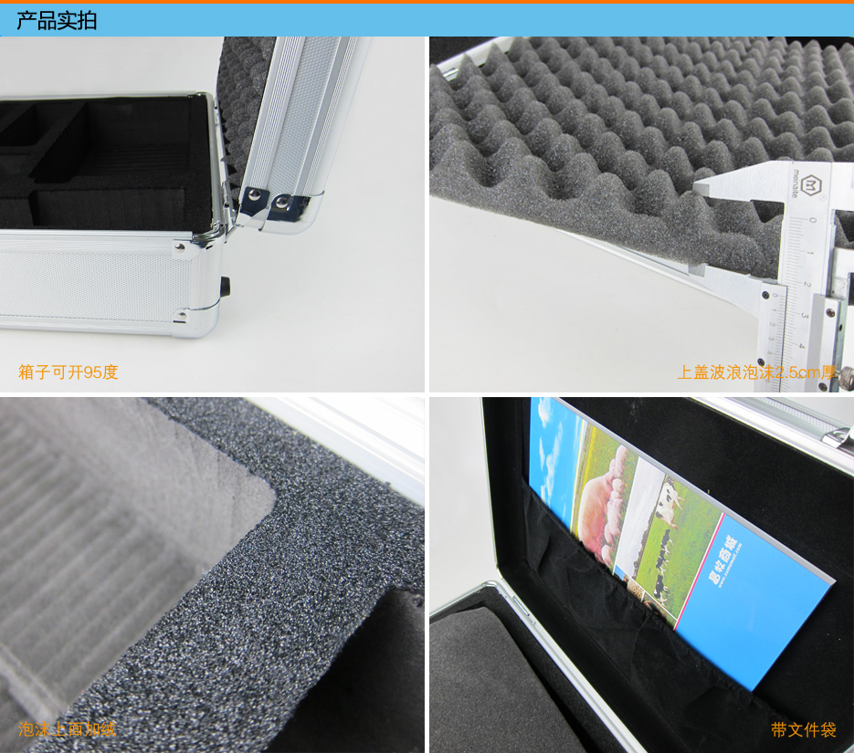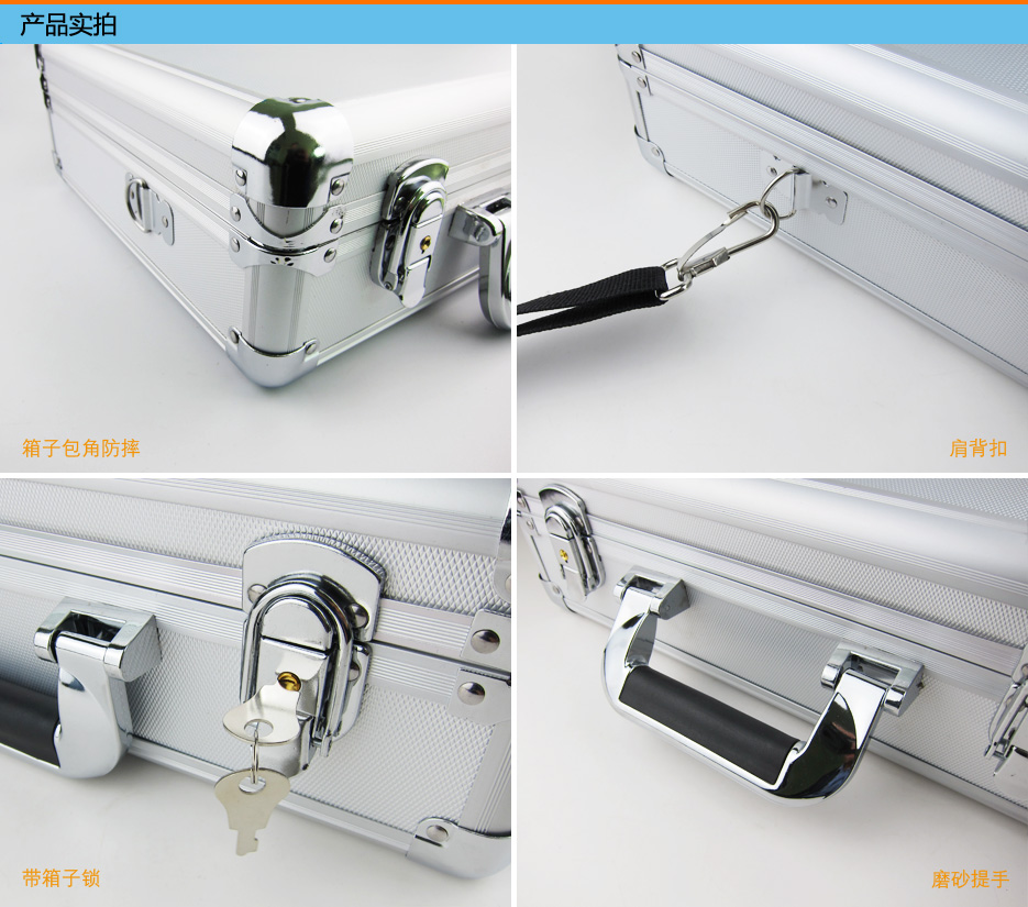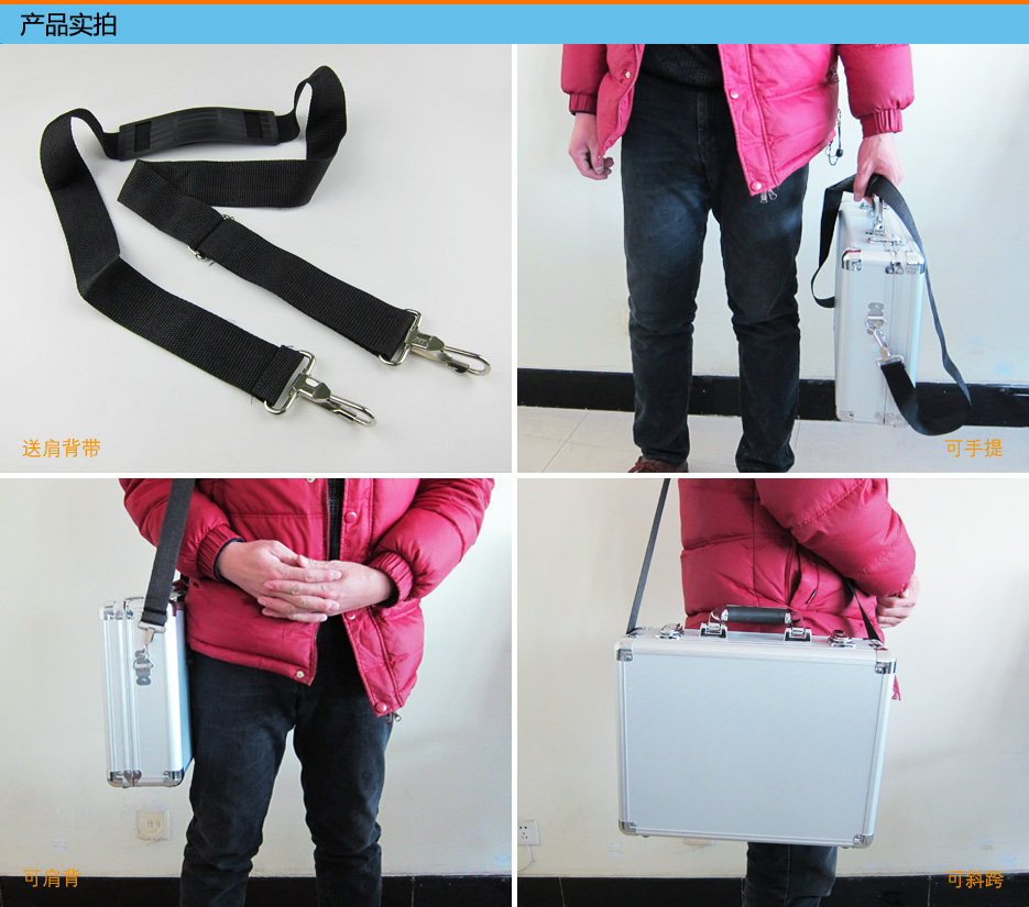 产品名称: B超铝合金箱(B超机箱子) 产品介绍: 1.B超箱整体银色铝合金材质,高端大气。 2.四角包边处理,发货/使用防摔防碰。 3.仿皮磨砂提手,手感舒适防滑。 4.配备钥匙锁,可防止小孩等非工作人员使用。 5.箱子内部泡沫开孔挖槽,防护B超机、探头等磕碰。 6.箱子两侧配肩背扣送肩背带一条,可肩背/斜跨/手提等,便于携带。