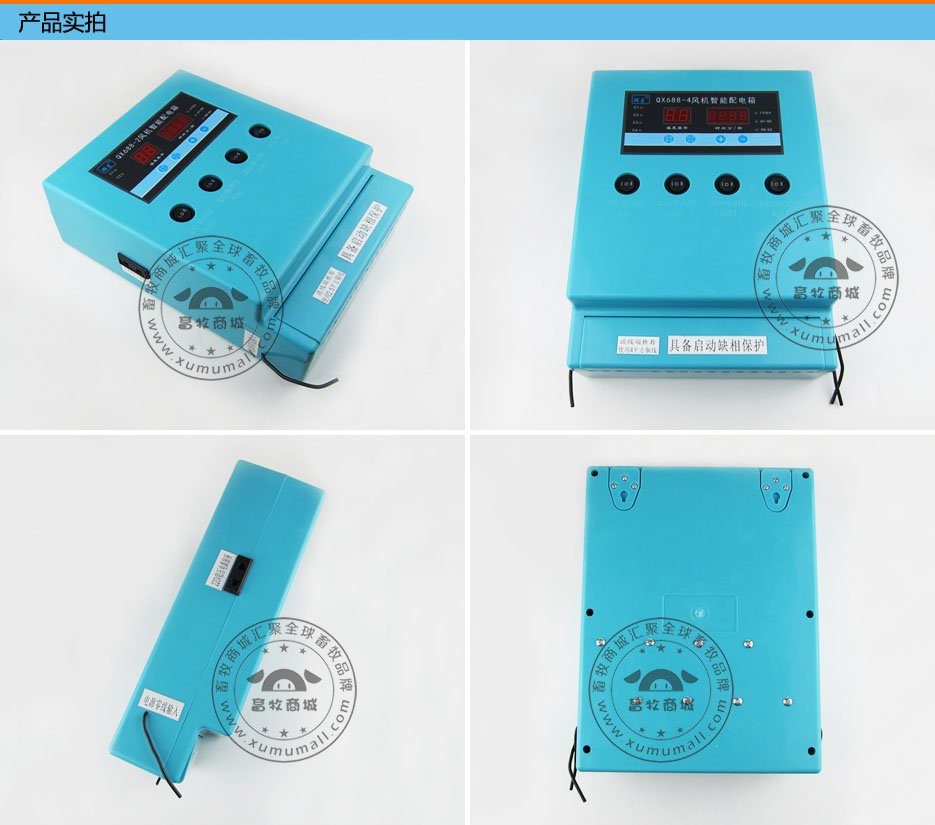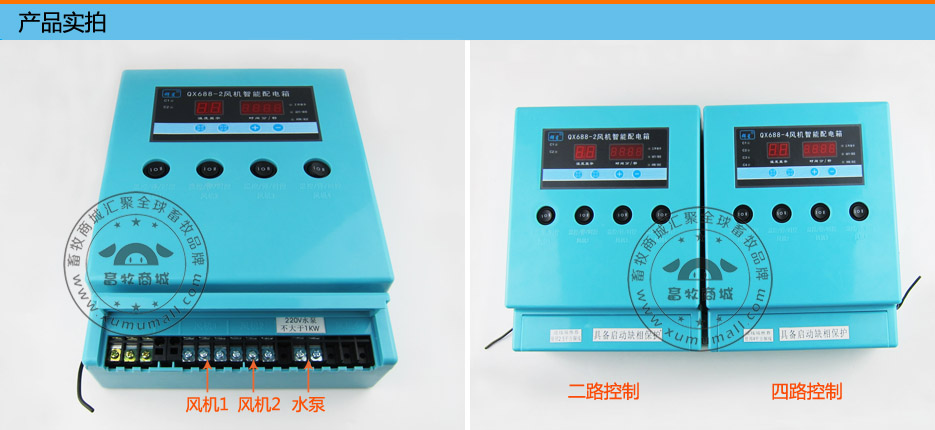 产品信息: 名称:风机温控箱(2路、4路等)可接1个水泵,带有启动缺相保护功能 产品参数: 温度:1℃—50℃(可任意设定各台风机温度点,互不受影响) 时控:1—60分、1—60秒 功率:≤2千瓦 电压:380V 探头线长度:8米 工作模式(三种): 1.温控模式:仪表受温度控制 2.时控模式:仪表受循环时间控制 3.手动模式:仪表受手动开关控制 明装,可悬挂,轨道,螺丝固定可控制负压风机,冷风机,轴流风机,排气扇等降温设备。