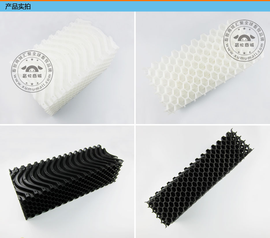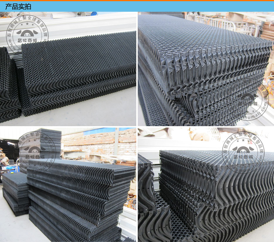 产品信息: 名称:塑料水帘(塑料湿帘) 产品介绍: 一、采用高分子材料与空间交联技术的塑料水帘具有强力盛水性、抗霉变、寿命长等优点。 二、蒸发降温效率达80%以上 三、自然吸水、扩散速度快、效能持久、不含易使人过敏的物质、绿色、环保、安全、节能、经济适用。 产品特点: 1、通风不递减 2、可高压清洗 3、使用寿命长、不变形、不阻塞 4、厚度为15mm、高度和宽度可根据要求订做。 5、可定做外框pvc、不锈钢、铝合金等材质。 6、可定做黑色和白色