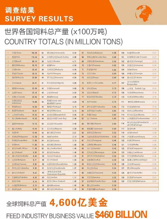在全球饲料产量前10的国家中中国仍然拔得头筹。其他位居前10的国家依次为美国,巴西,墨西哥,印度,西班牙,俄罗斯,日本,德国以及法国。