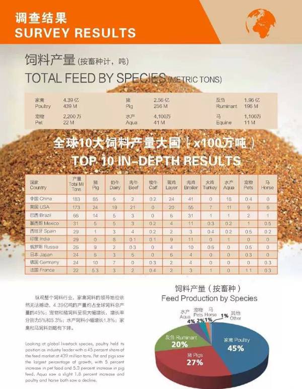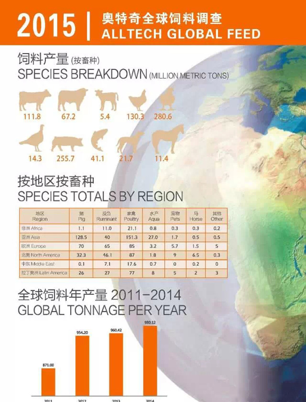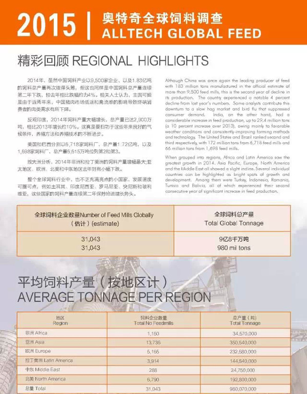 奥特奇于近日发布了2015年全球饲料调查报告。这份珍贵而富有前瞻性的报告为我们提供了探究全球饲料行业的独特视角。同时,这份报告的数据收集,整理和分析也绝非易事。我们会尽可能的从当地饲料协会或机构中获取准确信息,但在世界的很多国家和地区,我们只能依靠奥特奇的全球销售团队去收集第一手的数据。希望我们精心准备的这份报告能够对您有所帮助!