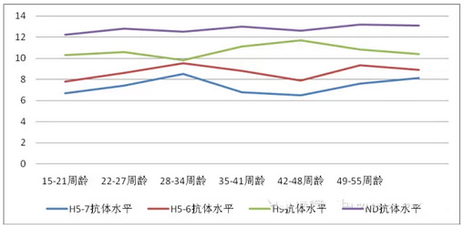 通过市场送检样品抗体值检测分析得出,商品蛋鸡和种鸡在开产后H5-6株、H5-7株的抗体效价在7以上,H9、ND抗体效价在9以上,在此滴度之上均能起到免疫保护作用。图5中的商品肉鸡H9、ND的抗体效价在8左右,在此滴度之上均能起到免疫保护作用。