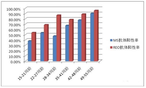 通过市场送检样品抗体检测分析得出,MS、REO抗体阳性率是随着周龄的增长而抗体阳性率增高,并且REO整体阳性率比MS的阳性率相应的要高。测得的抗体为阳性,说明鸡群免疫过该两种病的疫苗或感染过该两种病。就送检的血清样本大部分是未免疫疫苗的,应该加强防控措施,预防该病的发生。