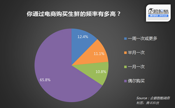 虽然生鲜被认为是黏性高、重复购买率高的品类,很多综合型电商平台布局生鲜也是希望通过生鲜的这些特点来提高用户对自身平台的黏性。但从调查数据来看,已形成高频购买习惯的用户并不多:一周买一次(或更多)的用户占12.4%,半月买一次的用户占11.1%。目前,偶尔购买的用户占大多数,高达65.8%。
