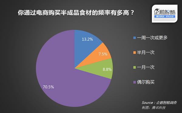 121414197另外,已形成高频购买习惯的用户也比较少,半月内至少会购买一次半成品食材的用户占20.7%。超过七成用户仅是偶尔购买。