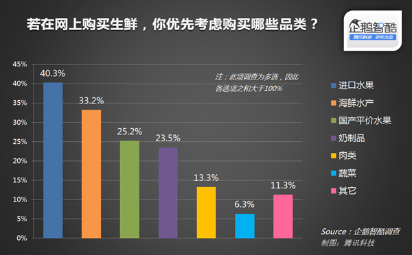 在各种生鲜品类里,进口水果最受生鲜电商用户的青睐,40.3%的用户优先考虑购买进口水果,次之的分别是海鲜水产、国产平价水果和奶制品。购买意愿最低的则是蔬菜。