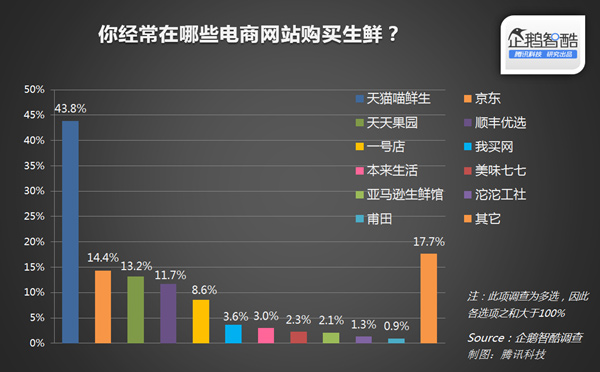 虽然目前生鲜电商市场上玩家众多,但天猫占据了明显的份额优势,其渗透率达到43.8%,其后三名分别是京东、天天果园和顺丰优选,渗透率介于11%到15%之间。