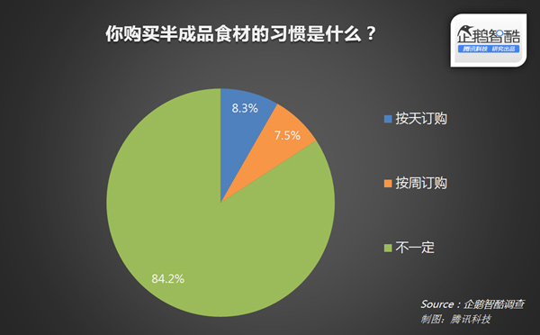 在购买习惯方面,8.3%的用户表示按天订购,即当天预定第二天的食材;7.5%的用户则是按周订购,即一次性预定一周所需的食材。其余超过八成的绝大部分用户并没有形成规律的订购习惯。