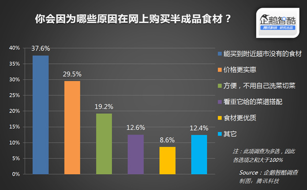 37.6%的用户在网上购买半成品食材是因为能买到附近没有的食材。这也是用户对半成品食材电商最主要的诉求,其次则是价格便宜。