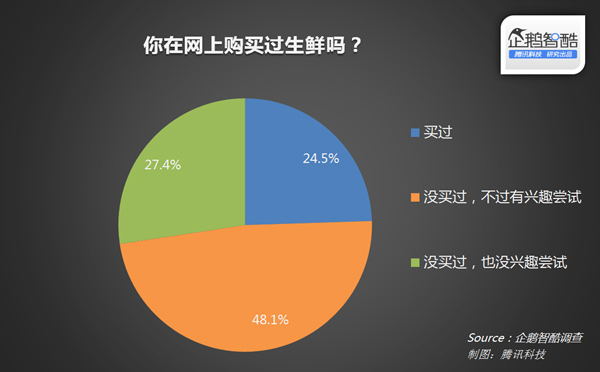 生鲜电商尚未进入到大规模普及阶段,在网上购买过生鲜的用户仅占24.5%。但却有将近半数的用户表示未来有兴趣尝试,而这部分用户则是生鲜电商的潜在用户。完全不感兴趣的用户不足三成。可以说,生鲜电商在用户规模和市场规模上还存在较大增长空间。