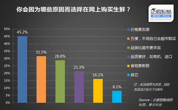 45.2%的用户在网上购买生鲜的主要原因是价格更实惠。