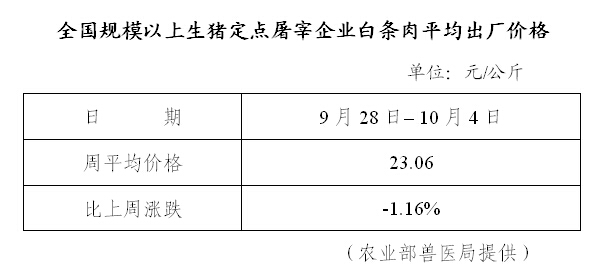 农业部公布2015年9月28日–10月4日生猪定点屠宰企业白条肉平均出厂价。