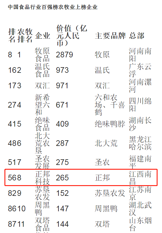 2021胡润中国食品行业百强榜发布,正邦科技进入中国农牧业10强,中国食品行业60强