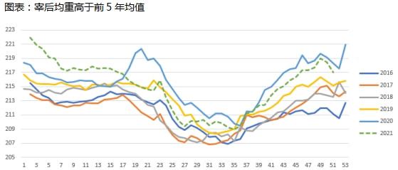 国庆节过后,随着猪价持续走强,养殖户惜售导致生猪出栏体重延续增加。进入12月以后,大猪压栏积极性下降,出栏均重延续下降。卓创样本点统计的周度出栏体重数据显示,12月16日,中国生猪周度交易均重123.46公斤/头,较11月底下降1.93公斤/头。