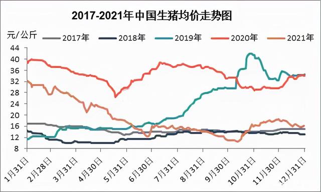 截至2021年12月29日,全国生猪外三元生猪均价为16.32元/公斤,和年初相比,猪价下滑20.74元/公斤,降幅达到了55%。年内最高点为1月4日的37.12元/公斤,最低点为10月8日的10.54元/公斤。纵观整个2021年,生猪价格整体处于下跌通道,期间在上半年和下半年,各出现过一次短暂的反弹行情,但跌速和跌幅都超出了行业预期。